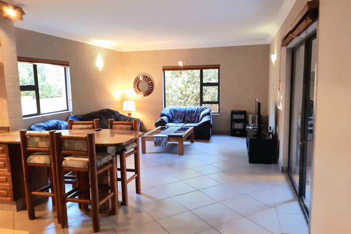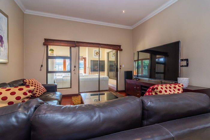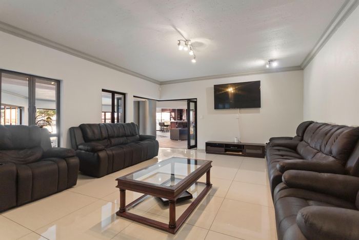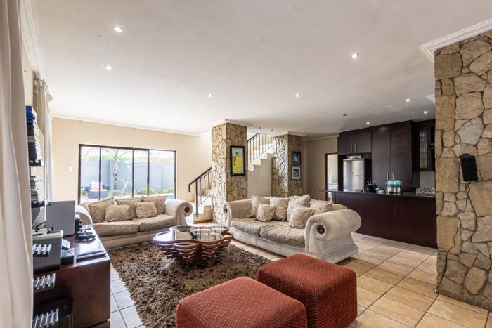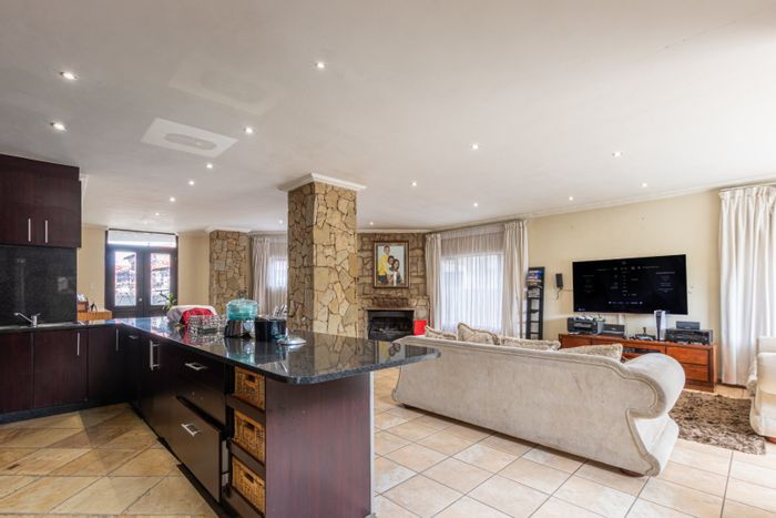 Resort-style family living in Ruimsig’s 24/7 estate opposite the Country Club — seamless indoor-outdoor flow to large lapa and pool, with five bedrooms, three baths and double garage.