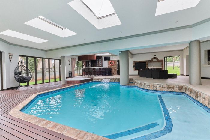 Entertain effortlessly across from Ruimsig Country Club — glass-enclosed indoor pool and jacuzzi with bar, pizza oven, expansive smallholding lawn; five-bedroom main house, six-car garage, two-bedroom cottage.