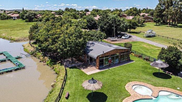 Savour Vaal Marina golf-estate living with dam access and clubhouse amenities; entertainers' open-plan living featuring a fireplace and built-in bar, modern kitchen, five bedrooms and three baths.