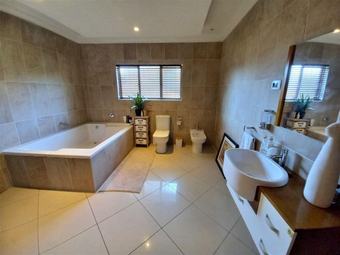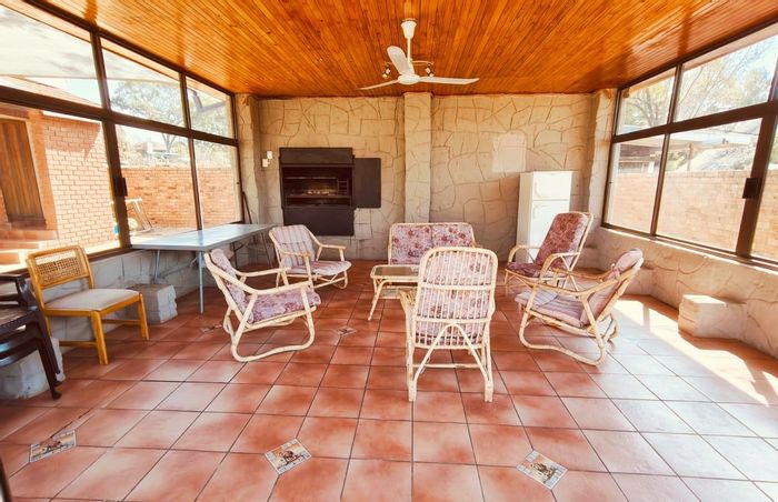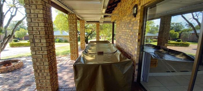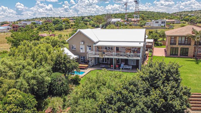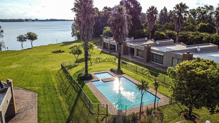 Vaaldam waterside living with sailing-club views, covered braai patio and splash pool; double-storey thatch entertainment room with upstairs bar. Four bedrooms, three bathrooms, huge garages for boats and caravans.