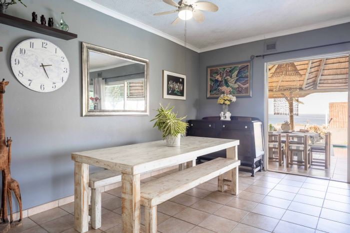 Coastal entertaining and relaxed beachside living in Warner Beach with ocean views, manicured garden and thatched entertainment area with pool — open-plan kitchen and three bedrooms, two baths.