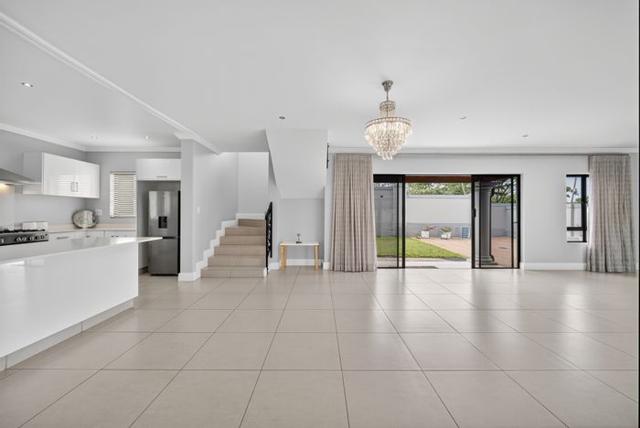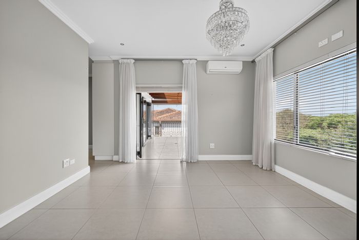 Relaxed coastal entertaining in Brooklyn Estate, Ballito, with light-filled open-plan living and covered patio overlooking a landscaped, pet-friendly garden — four bedrooms, three baths, double garage.
