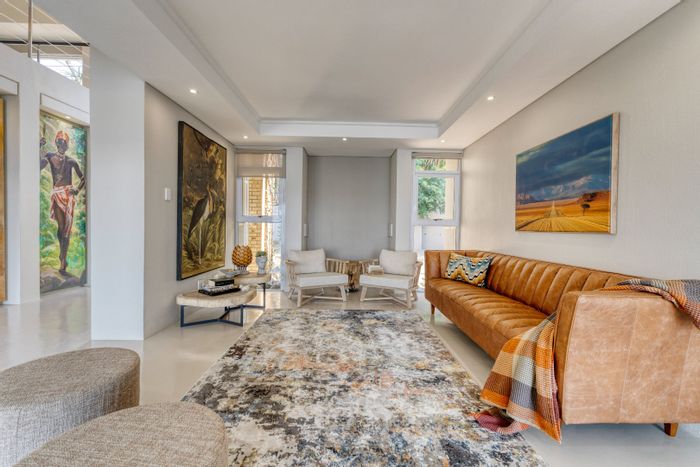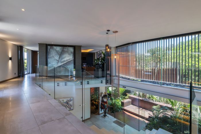 Secluded forest retreat in Zimbali Estate with double-volume entrance and seamless indoor–outdoor flow, private decks and entertainment area with built-in braai and splash pool; four en-suite bedrooms, double garage.