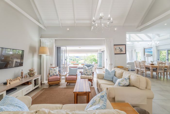 Coastal sanctuary on KZN North Coast's Simbithi Eco Estate — single-level home with exposed beams, north-facing deck, pool and direct greenbelt access. Four bedrooms, three bathrooms.