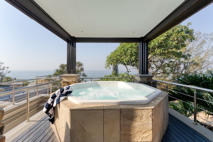 Walk to Salt Rock Beach from this spacious family home with sweeping sea views, L-shaped veranda and pool, manicured garden, solar backup and robust security — 4 beds, 2.5 baths.