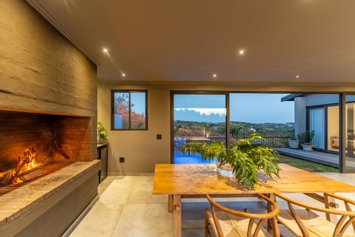 Panoramic 180-degree views over Simbithi Eco Estate’s green belts and dams, seamless indoor-outdoor living with L-shaped pool and veranda, solar-backed energy and 21,000L water storage. Four bedrooms, 4.5 bathrooms.
