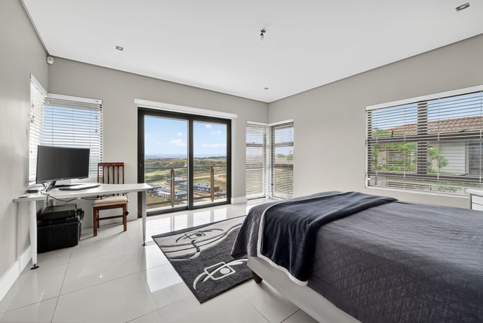 Resort-style entertaining in Zimbali Estate with sweeping coastal views, private pool and built-in braai—grand balcony and golf-cart garage. Four bedrooms, four bathrooms and double garage.