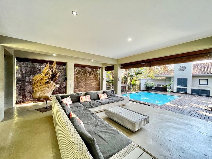 Resort-style coastal living in Zimbali Estate with private garden, pool and entertainment patio; oversized main suite with balcony, modern kitchen and scullery — five bedrooms, double garage.