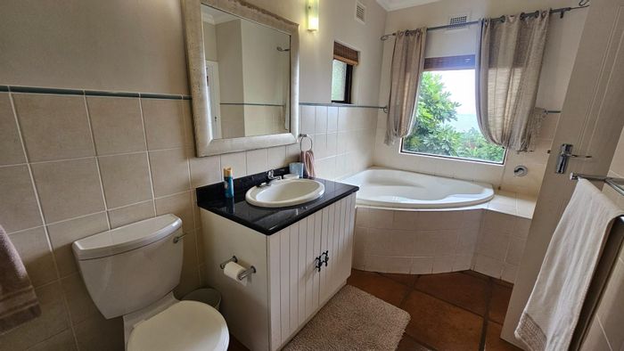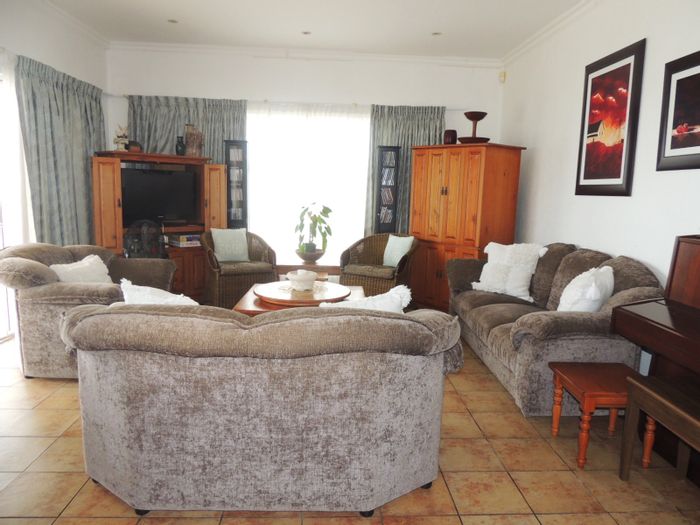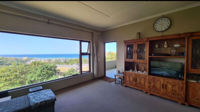 Coastal entertainer's dream with panoramic sea views, landscaped garden and pool; expansive thatched entertainment area with built-in braai and bar. Dual living: 6 beds, 5 baths, double garage.