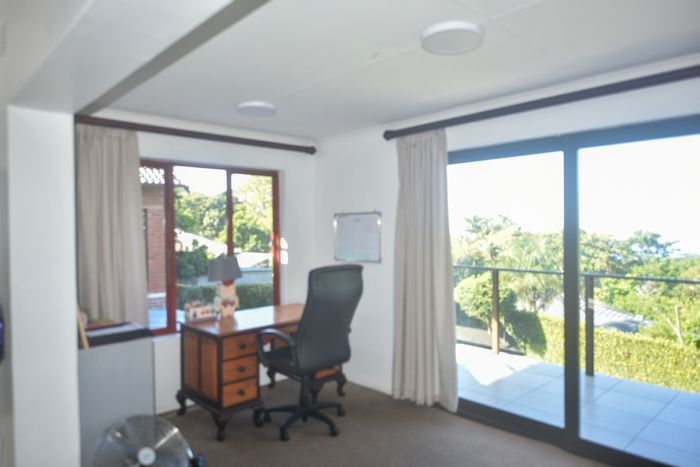 Coastal entertaining lifestyle on the South Coast — panoramic ocean views and a pool overlooking the sea, indoor braai and knotty-pine ceilings; five bedrooms and generous parking.
