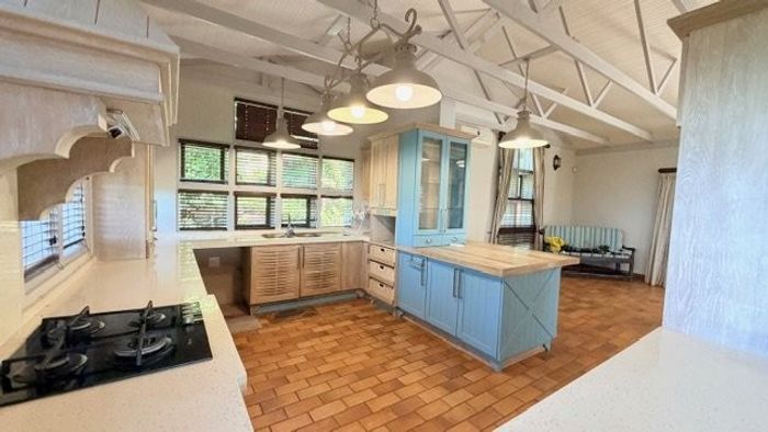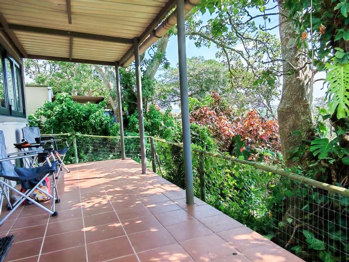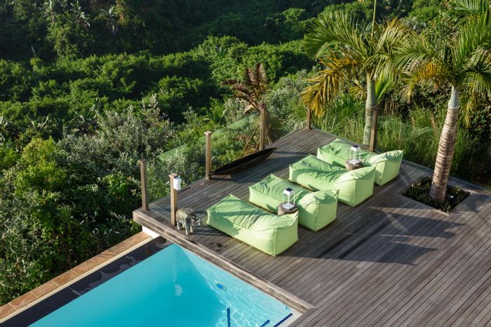 Coastal lifestyle with income from five self-catering cottages in upmarket Southbroom on the KZN South Coast, featuring a pool, deck overlooking bush, Bushbuck trail and ocean views.