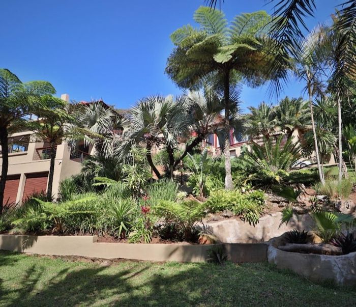 Tropical coastal living minutes from the Indian Ocean in Southbroom, KZN, set on 2000 m² of mature gardens with a covered veranda for alfresco dining; four bedrooms, three bathrooms, three automated garages.