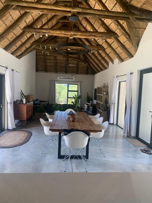 Riverside bushveld living in Umfula with frequent wildlife sightings and Olifants River views; open-plan living flows to a patio with splash pool and boma. Three en-suite bedrooms, double carport.