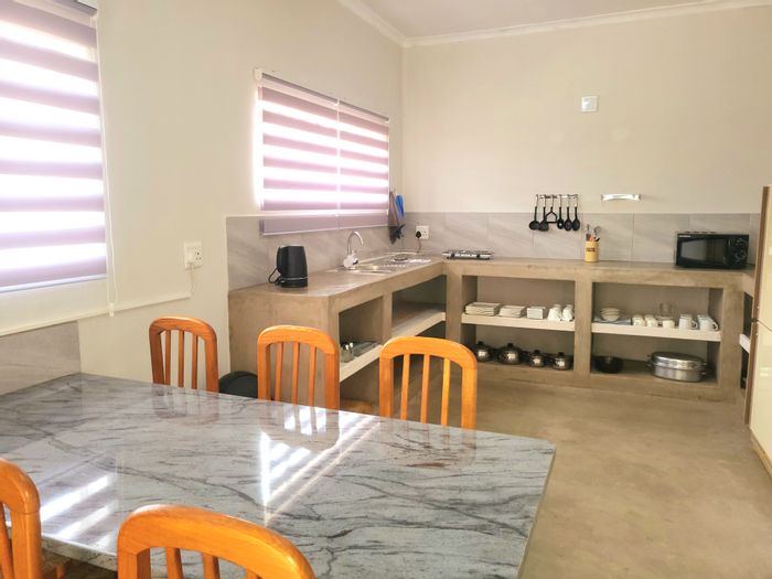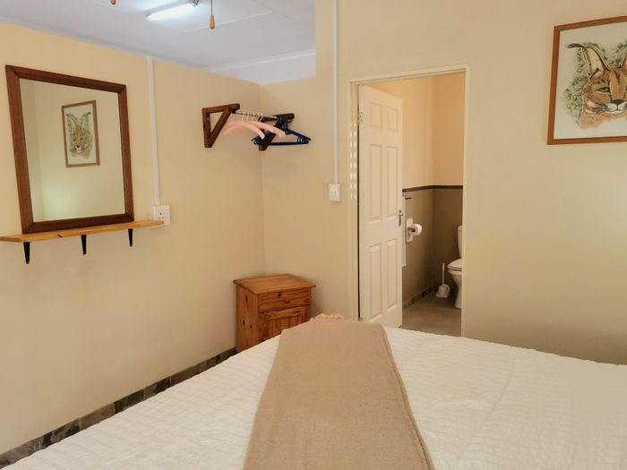 Bushside retreat in Marloth Park with open-plan living opening to a partially covered deck for wildlife viewing and stargazing; luxury power-controlled shower. Two bedrooms, one bathroom, covered parking.