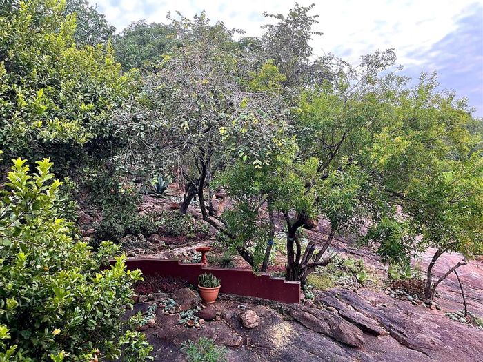 Relaxed lowveld living on Steiltes' outskirts near Nelspruit, set among indigenous trees with sunlit steel-frame windows and a rocky garden leading to a secluded patio with bush kitchen pizza oven.