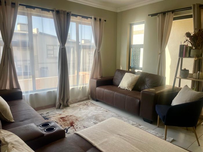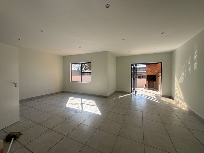 Enjoy secure, community-focused living in a sought-after gated complex with manicured grounds and 24-hour security — open-plan kitchen, covered braai for entertaining, three bedrooms, two baths, double garage.