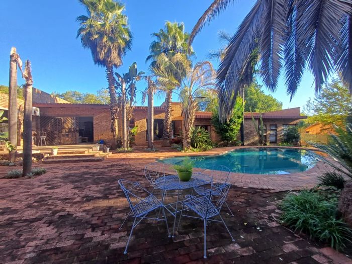 Relaxed bushveld living in Wilkoppies with spacious entertaining terraces and braai, sparkling pool; includes home office, staff suite, three bedrooms, two bathrooms.