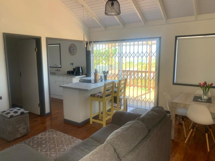 Relaxed coastal living in Betty's Bay, steps from reserves and penguins, with mountain and lake views, sheltered wooden deck with braai, fully enclosed garden — two beds, one bath.