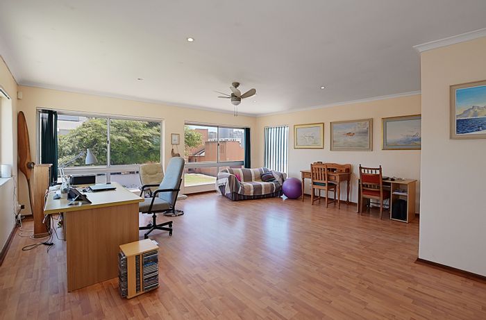 Relaxed family living on a quiet Sandown crescent, Cape Town, with excellent security and an inviting covered braai pergola; flexible four-bedroom layout includes downstairs suite, three bathrooms and double garage.