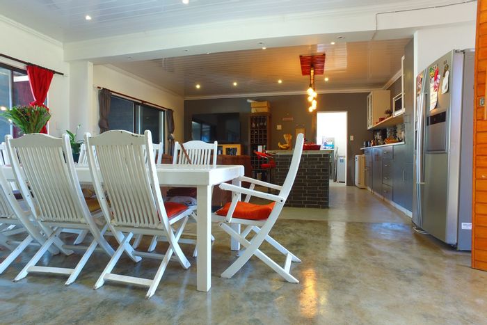 Relaxed coastal family living in Franskraal where friends linger — open-plan entertaining with bar and balcony mountain views, plus a separate three-bedroom flatlet; five beds, three baths, double garage.