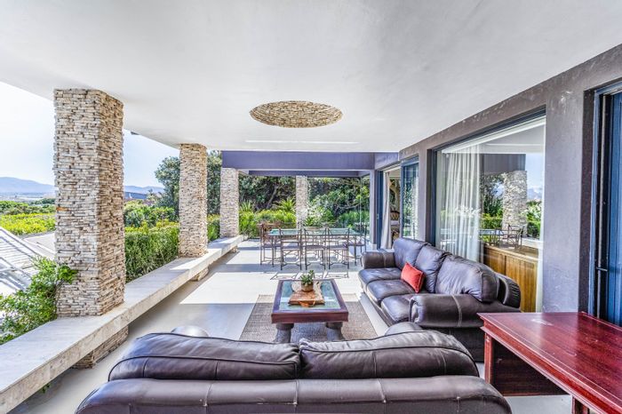 Seaside retreat in Franskraal with long sandy beaches and whale watching nearby; renovated home featuring panoramic ocean views and a gourmet kitchen — five bedrooms and three automated garages.