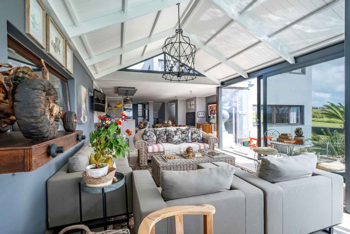 Coastal-meets-mountain living in Oubaai Golf Estate with panoramic ocean, golf course and Outeniqua Mountain views. Entertain effortlessly in an indoor braai room; four bedrooms, double garage.