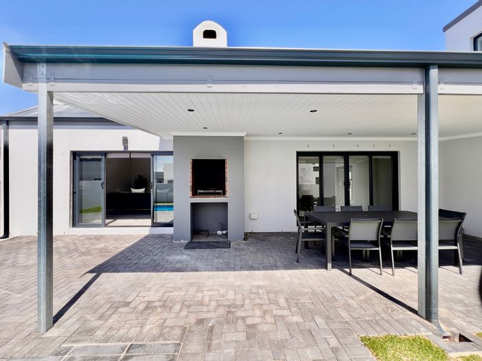 Coastal lifestyle in The Ridge Estate, Laguna Langebaan — open-plan living with indoor braai, balcony lagoon views and solar panels; four bedrooms, three bathrooms, double garage.