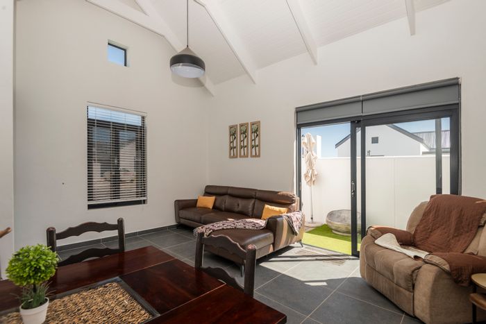 Relaxed coastal living in Wildflower Estate, minutes from Curro School, shops and Club Mykonos. Open-plan kitchen with indoor braai, communal garden, two en-suite bedrooms and single garage.