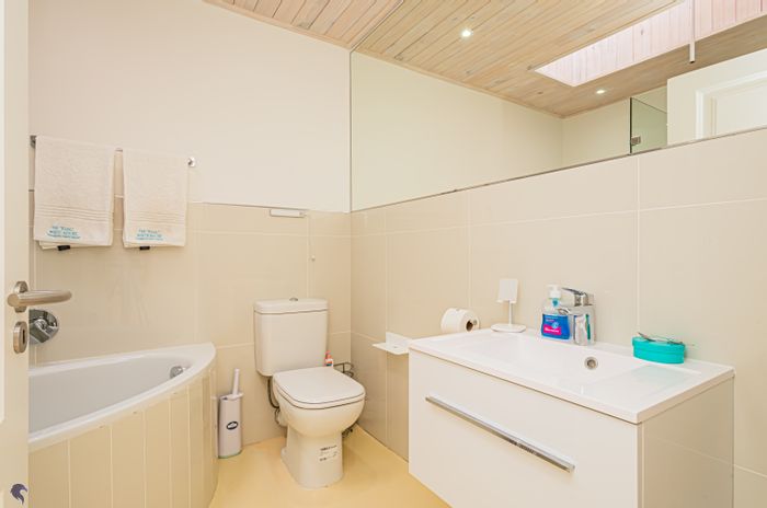 Coastal living and privacy in Langebaan, set on a pan-handle plot beside a lush greenbelt. Enjoy second-floor lagoon views, indoor and outdoor braai, and double garage. Three bedrooms, three baths.