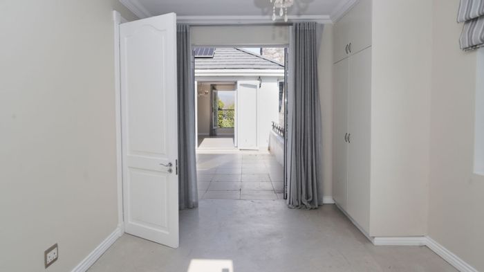 Winelands living in Val de Vie Estate, quiet tree-lined street near main gate; open-plan flow and enclosed patio with frameless doors and built-in braai. Three beds, two baths.