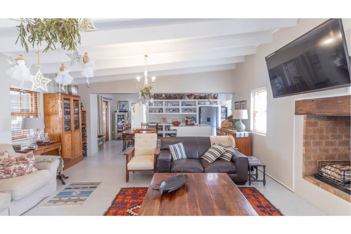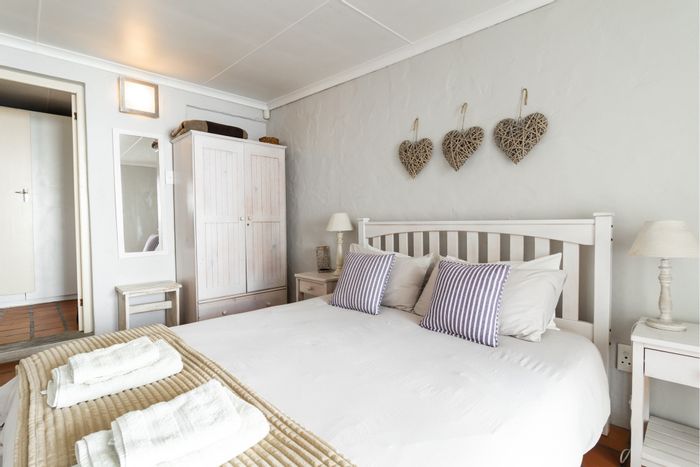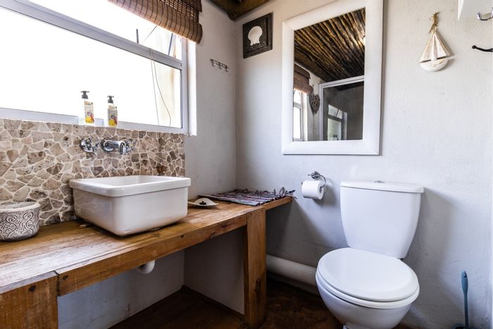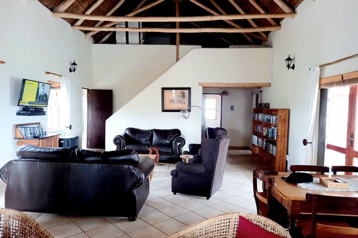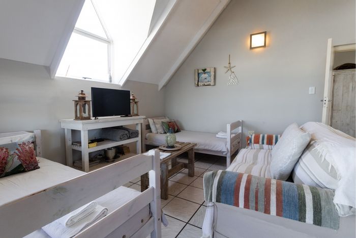 Relaxed coastal living in Jacobsbaai, steps from the beach and shoreline walks; expansive viewing deck with built-in braai, loft entertainment room, plus flatlet, 4 beds, 3 baths.