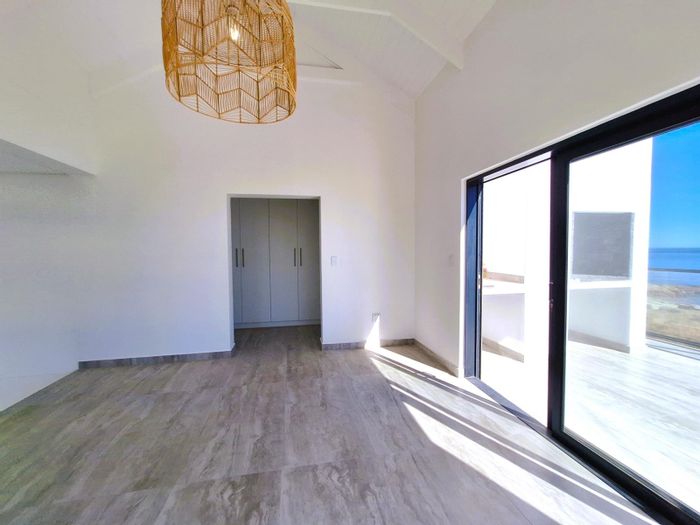 Steps from the Golden Mile Beach in Britannia Beach Estate, St Helena Bay — open-plan, double-volume living with built-in braai to patio. Two bedrooms, two bathrooms, automated double garage.