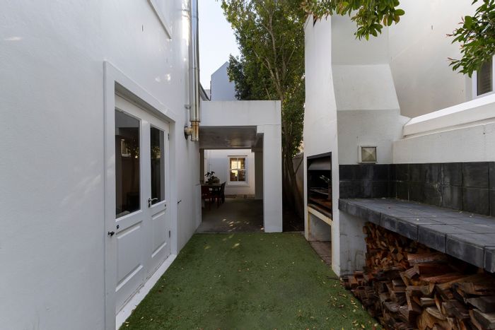 De Zalze family home in quiet Kleine Zalze village with easterly mountain views, multiple fireplaces, a large office with wall-length bookshelves and low-maintenance synthetic lawn. 4 beds, 3.5 baths.