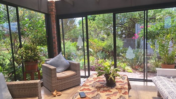 Riverside living with a manicured garden and sun-filled open-plan rooms that flow to a covered patio with built-in braai — includes a private-entrance suite, three bedrooms, two bathrooms.