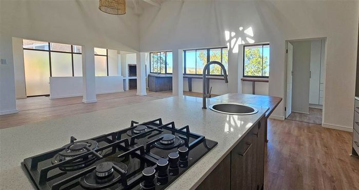 Hillside haven in coveted Stilbaai neighbourhood with panoramic coastal views, ideal for relaxed entertaining — marble gourmet kitchen, built-in braai, and landscaped low‑maintenance garden. Five beds, three baths, double garage.