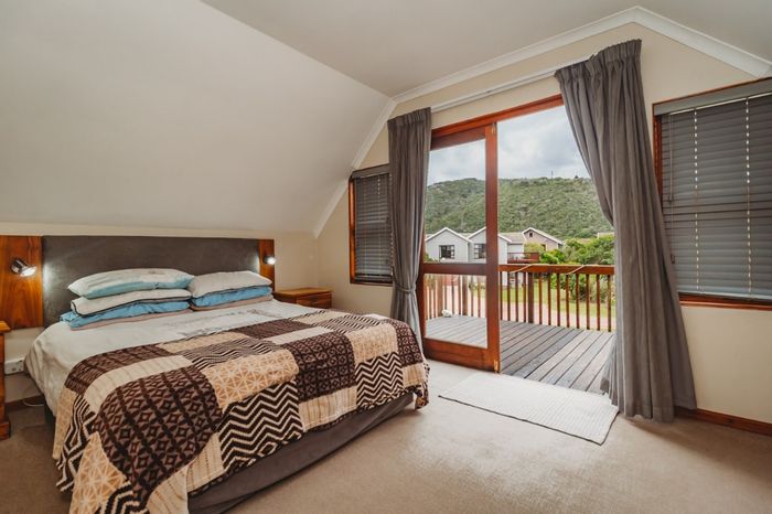 Riverfront retreat in exclusive Gregdale above Kaaimans River, minutes from Wilderness village and beaches — open-plan living with gas fireplace, undercover braai patio and expansive river deck; three bedrooms, three bathrooms.