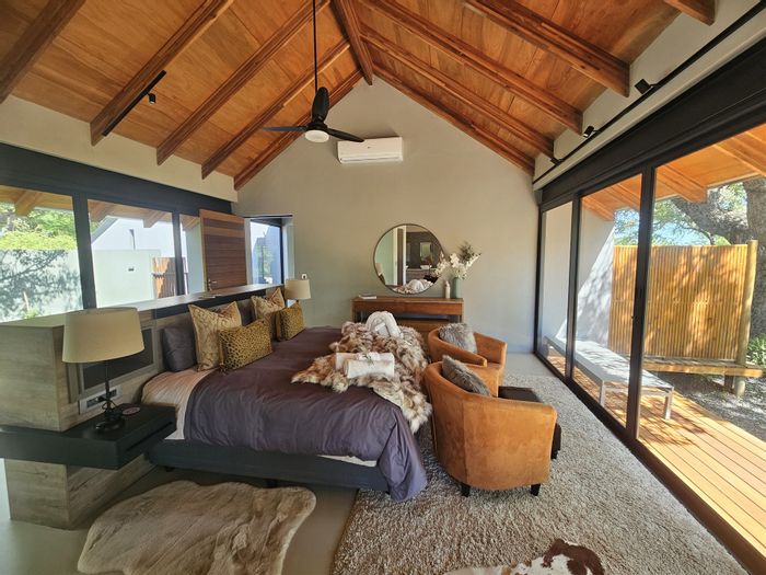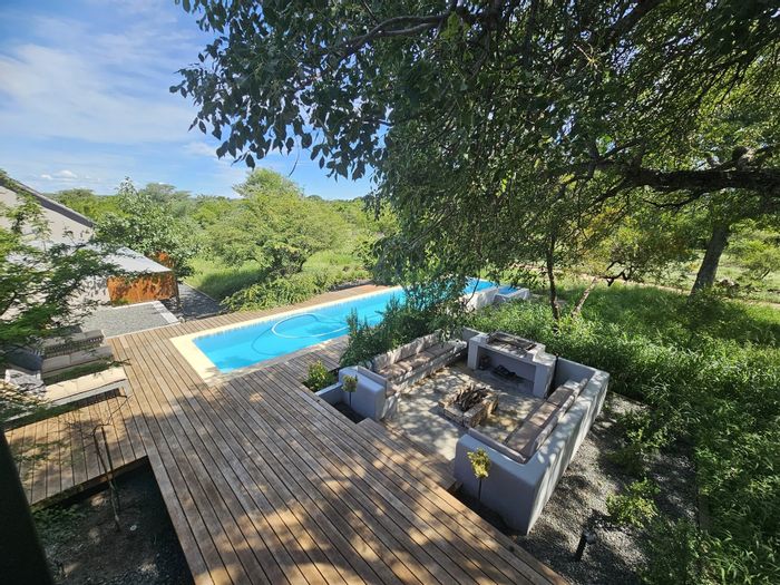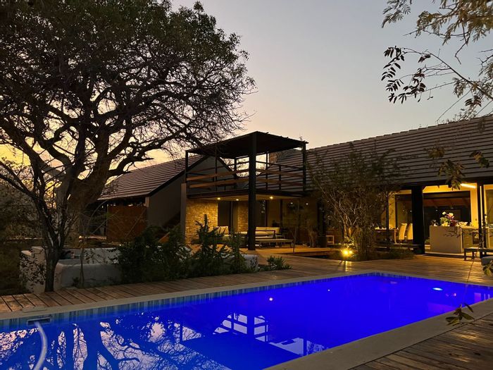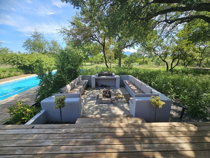 Bushveld retreat on a Big-4 reserve with a huge deck, bar, pool and boma for evenings around the fire; three en-suite bedrooms and double covered parking.