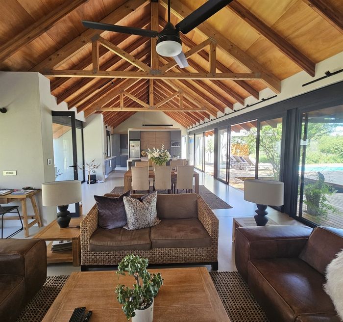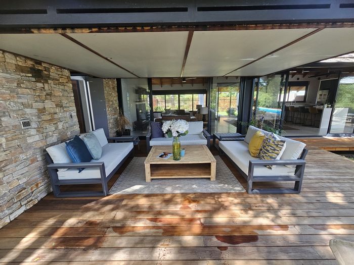 Enjoy bushveld living in Zandspruit Bush & Aero Estate with open-plan lounge, stone fireplace, marble island kitchen, covered patios, pool, boma and private decks overlooking roaming plains game.