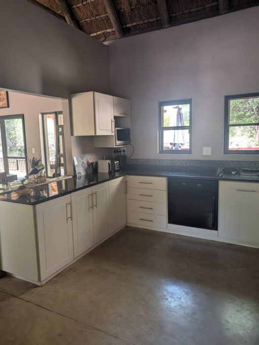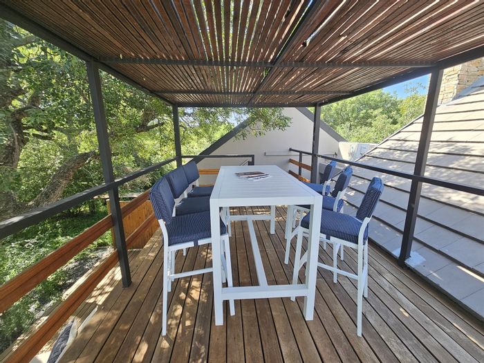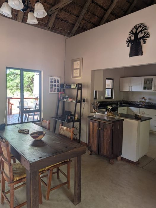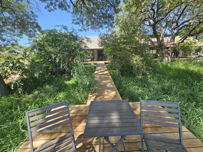 Bushveld retreat in Raptors View Wildlife Estate with abundant game and birdlife; covered entertaining deck, pool and outdoor showers, walking/cycling trails — three bedrooms, two bathrooms, fully furnished.
