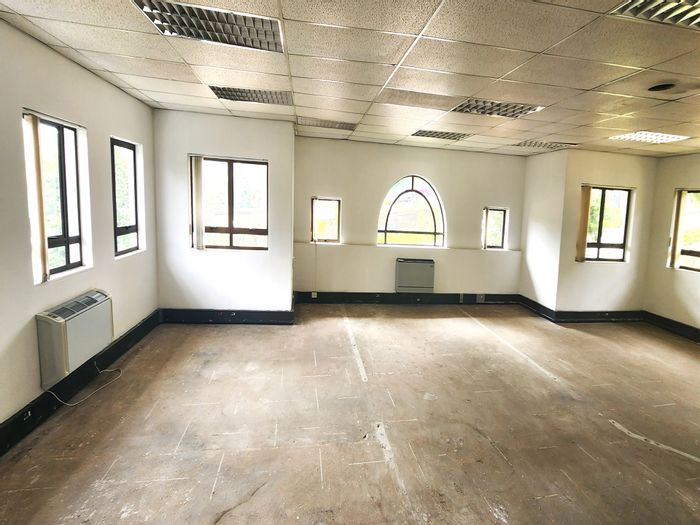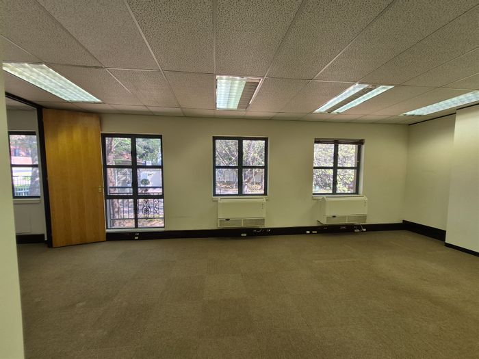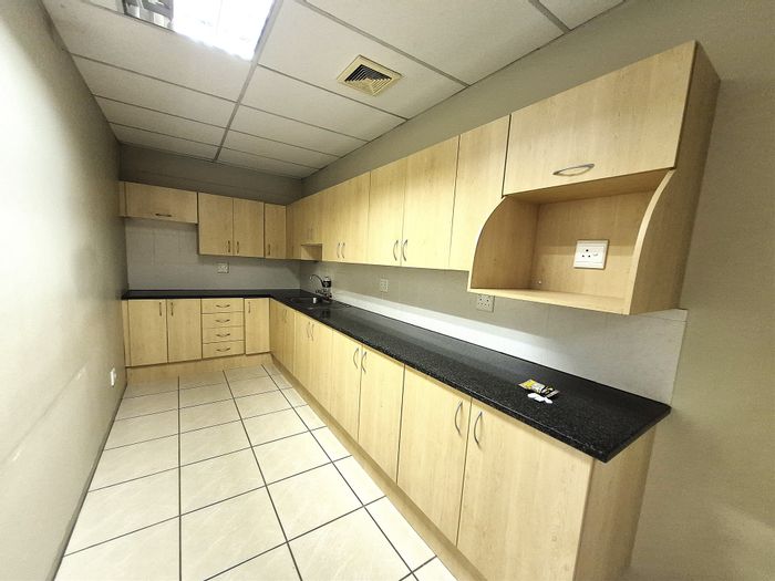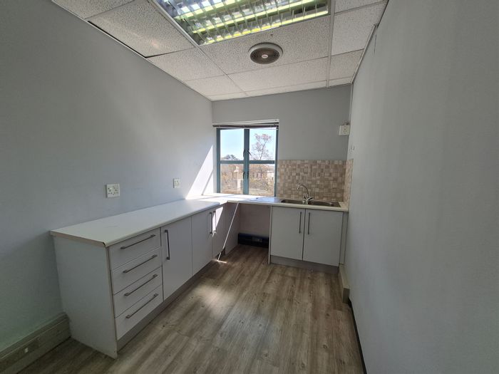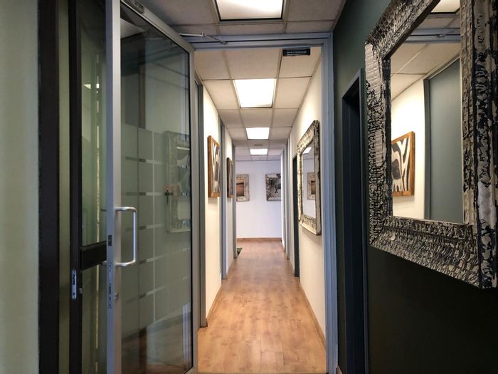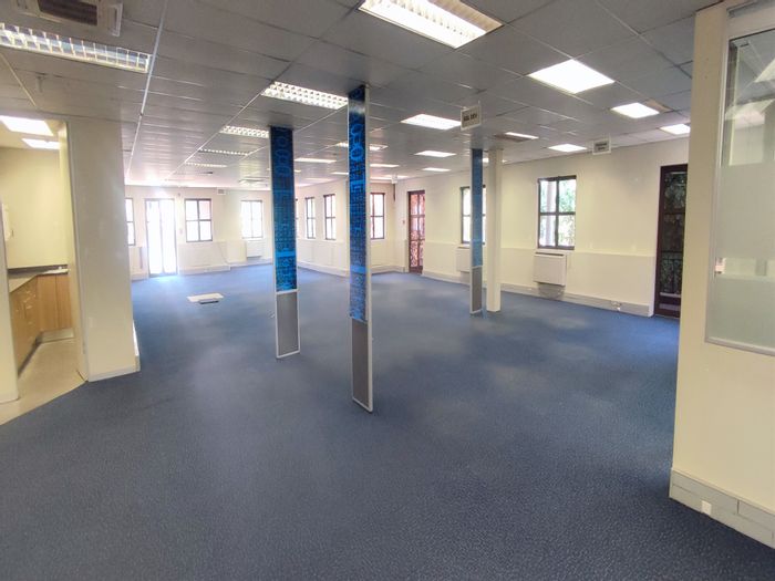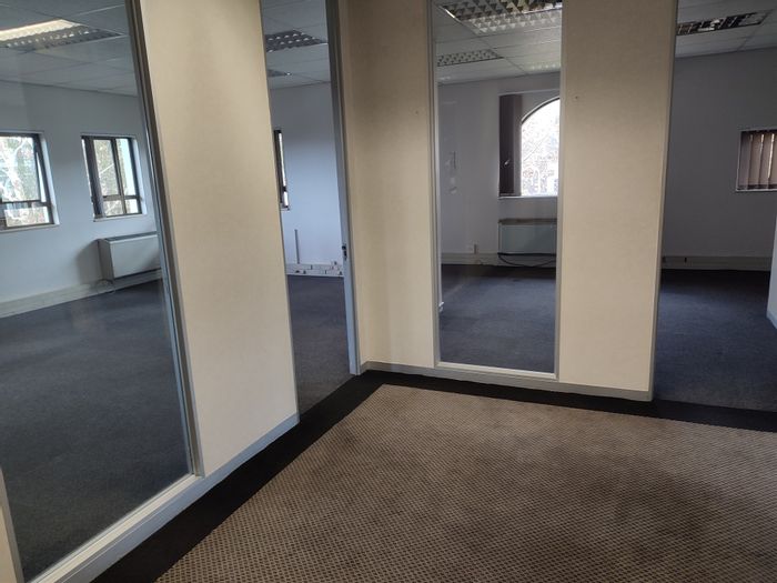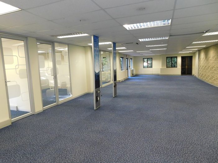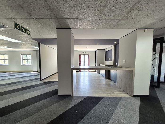 Exclusive first-floor suite in Fountain Grove, Hyde Park — on a two-suites level with large open-plan area, private office and fitted kitchen; secure complex with coffee shop and backup power. 218 m².