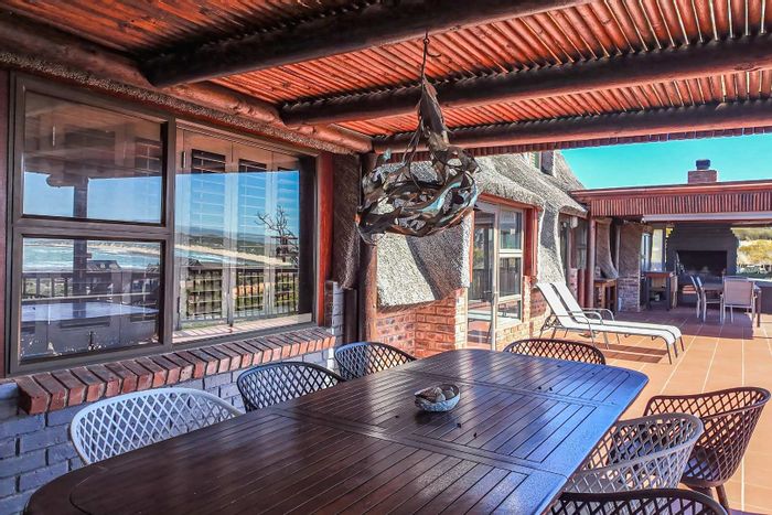 Beachside reserve living in Bosbokduin Estate with direct beach access and historic Visvywers; thatched home offers expansive ocean-view balconies, a country-style kitchen, five bedrooms, 3.5 baths, double garage.