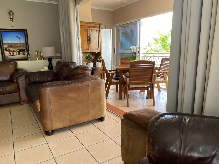 Seaside lock-up-and-go living across from shopping centres with easy main-route access, large patio with sea views, manicured communal gardens and pools; three bedrooms, two baths and two parking bays.