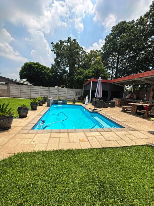 Resort-style entertaining in a quiet, family-friendly neighbourhood with pool, built-in braai and jacuzzi. Four bedrooms, two baths and parking for up to eight vehicles.