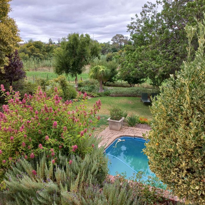 Peaceful farmstay near Calitzdorp with a guesthouse for hosting, pool, shaded gardens and walking paths — productive lucerne fields with secure irrigation rights. Seven bedrooms, seven bathrooms.