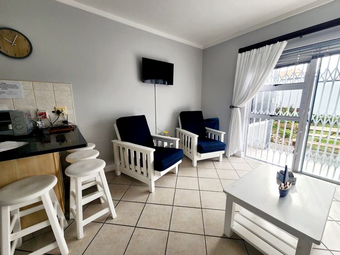 Relaxed coastal lifestyle a short walk from the ocean — furnished ground-floor apartment with open-plan kitchen, private garden with covered patio and built-in braai, three bedrooms.