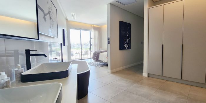 Resort-style living in Munyaka Estate, Waterfall City — penthouse with lagoon and skyline views from a large private balcony, sleek island kitchen, three bedrooms, three bathrooms.