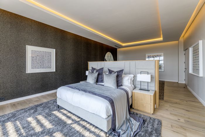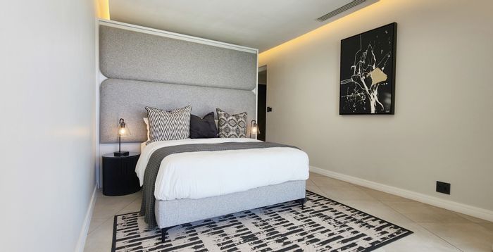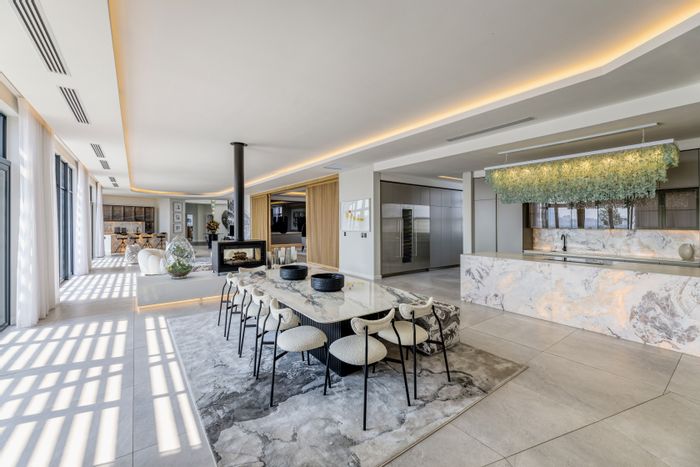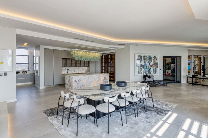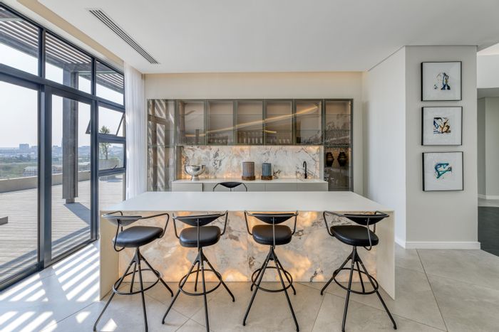 Perched above Blue Lagoon's beach with Waterfall and Sandton skyline views, a signature penthouse boasting a private rooftop jacuzzi, bespoke Stephen Pikus chandeliers, Gaggenau kitchens and butler suite.