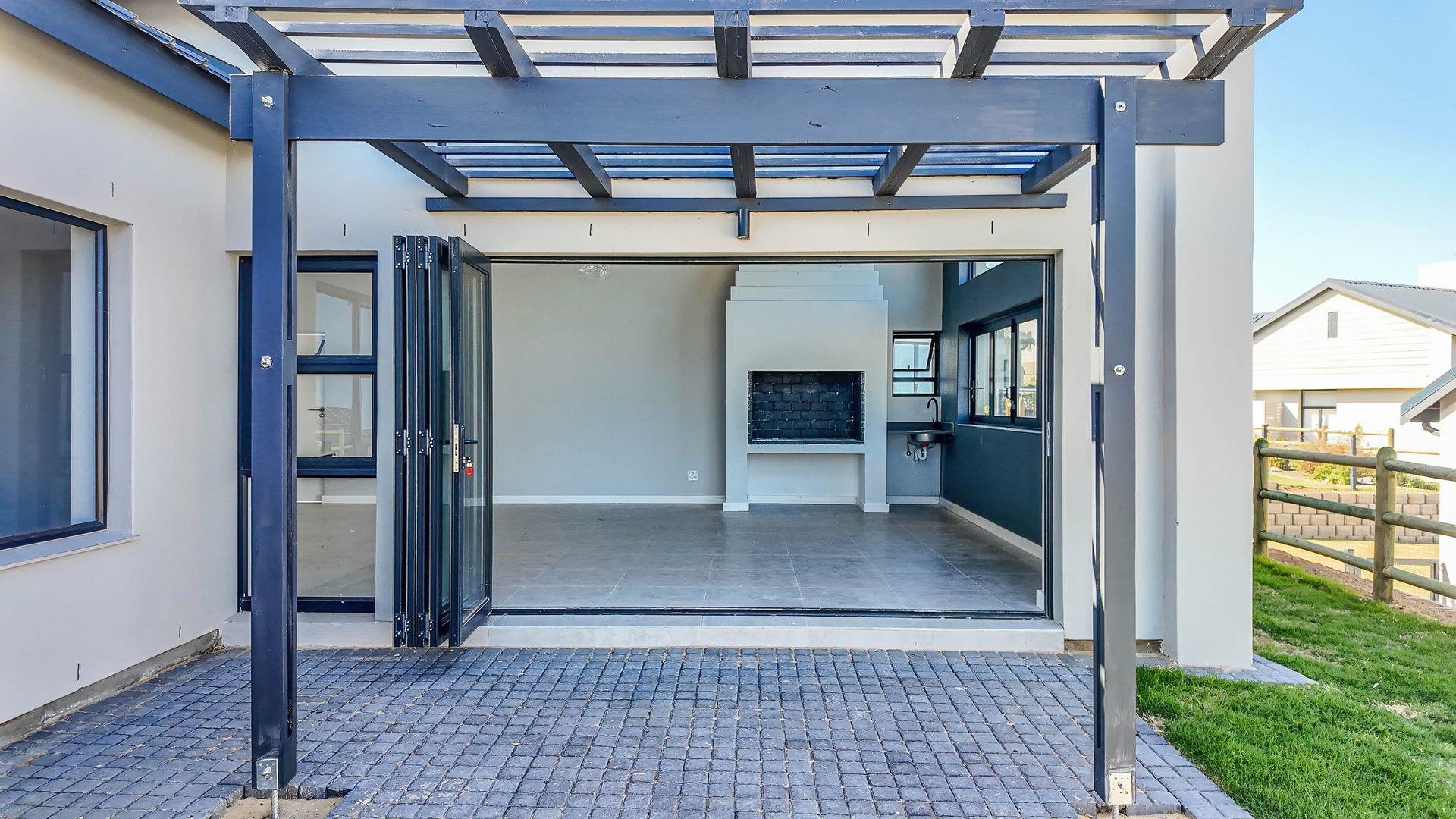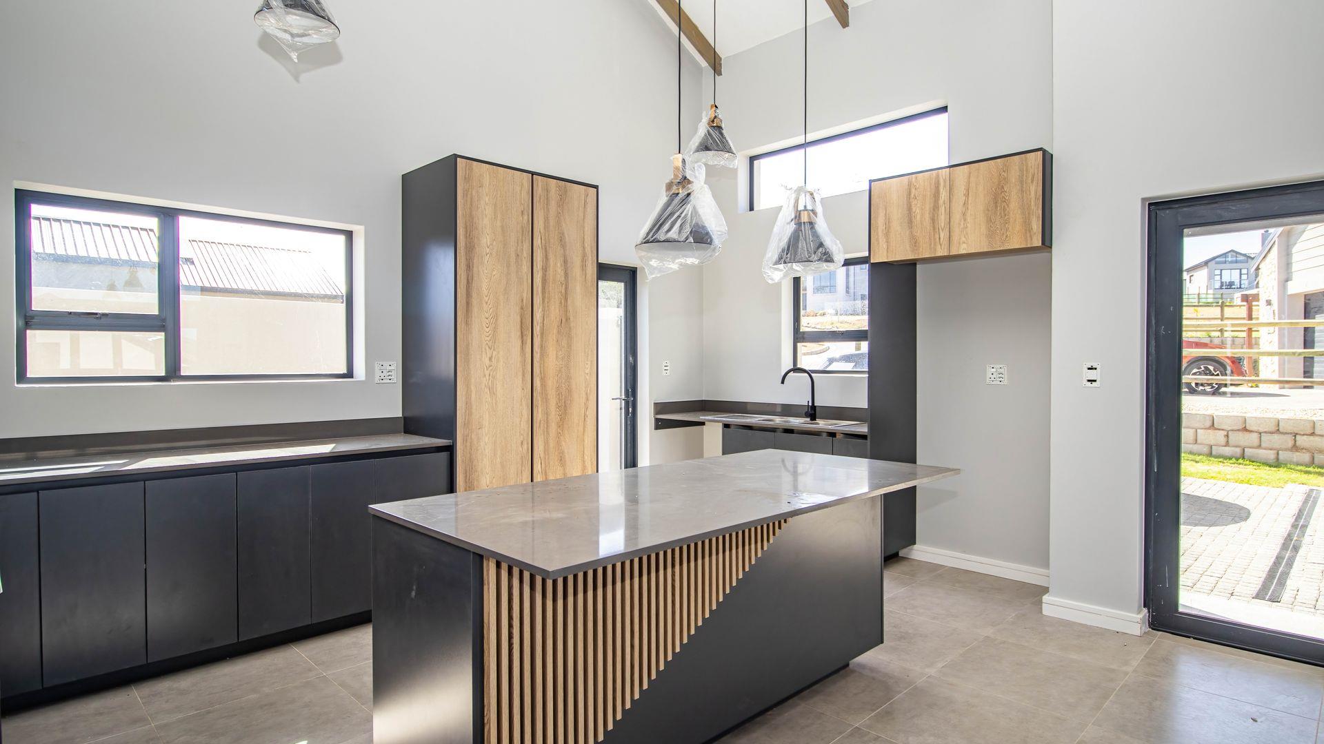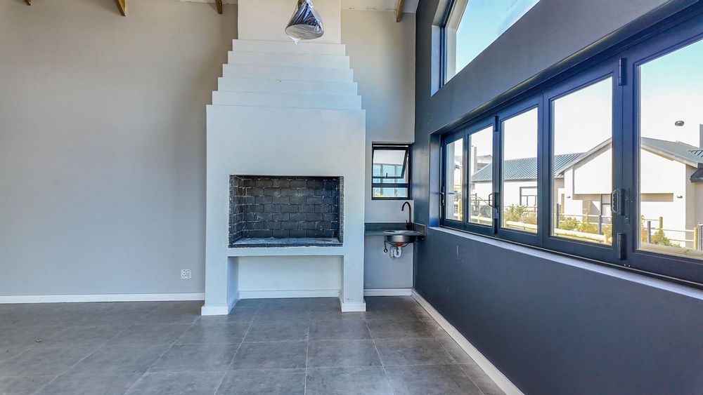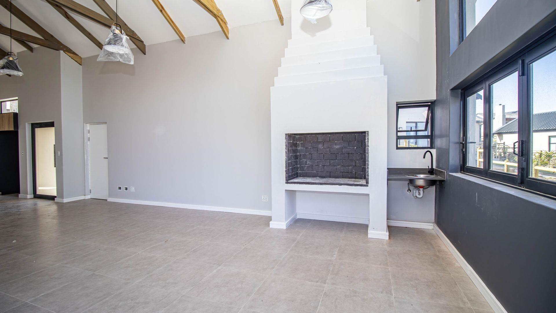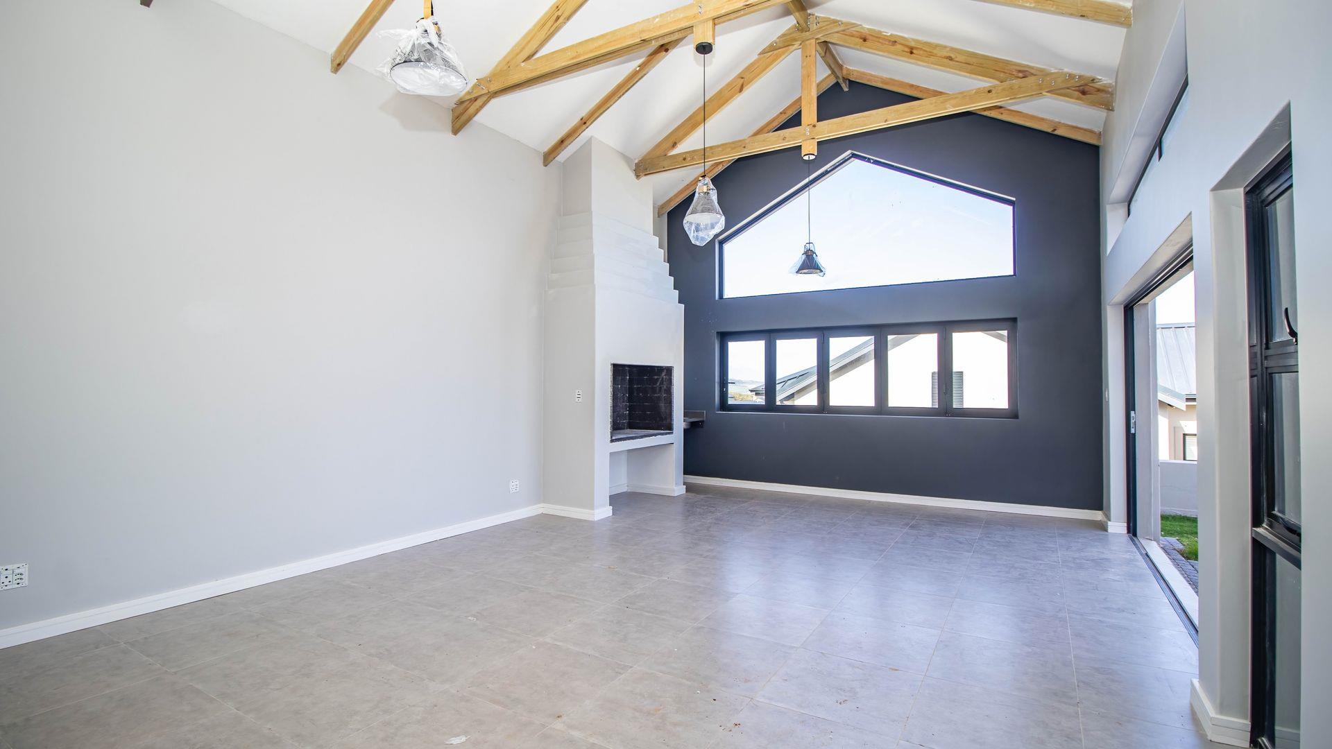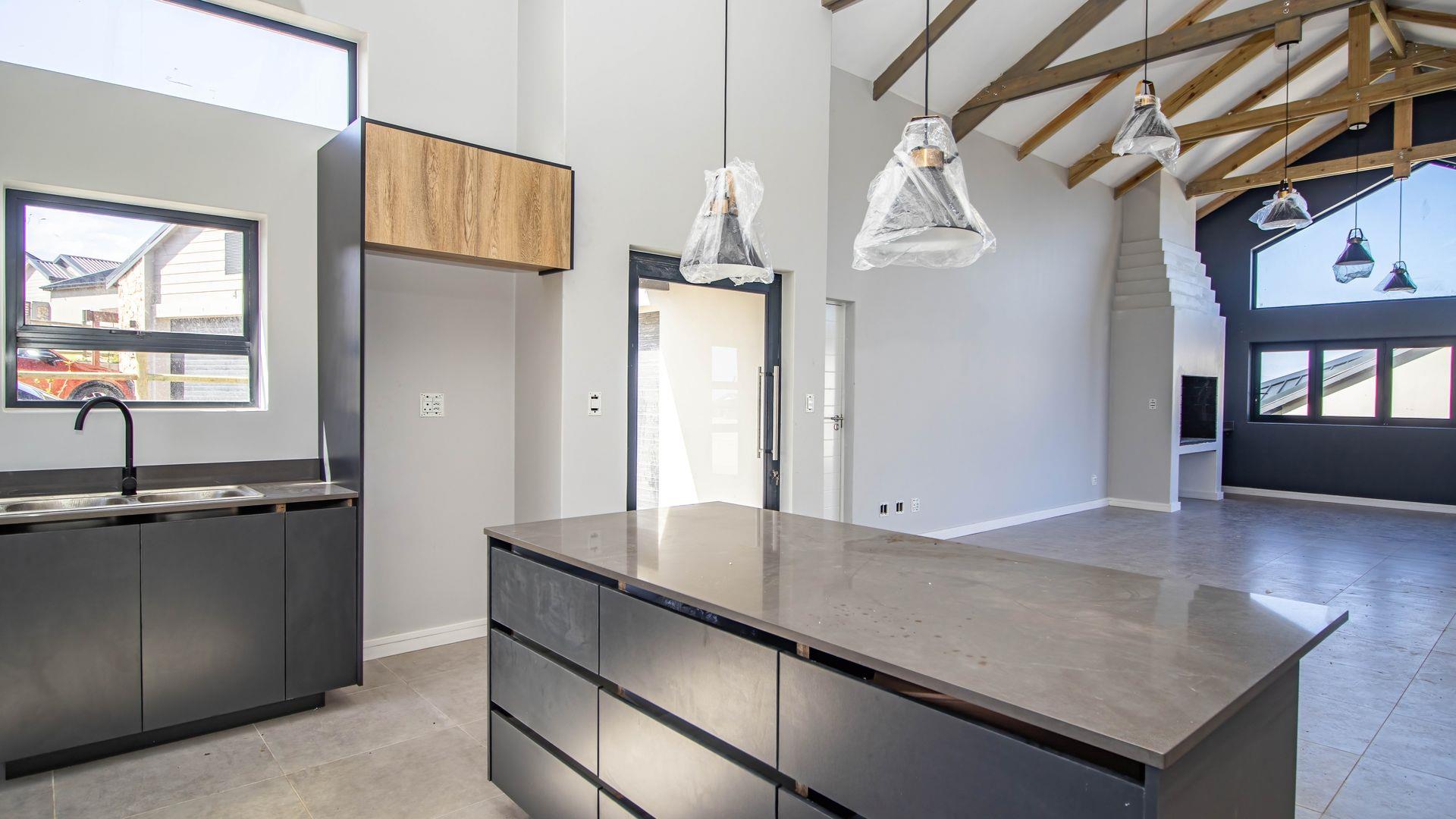 The open-plan living area also features an indoor braai area, making it ideal for entertaining guests regardless of the weather. The modern kitchen is a chef’s delight, equipped with a gas hob, electric oven, and ample cupboard space to cater to all your culinary needs.
