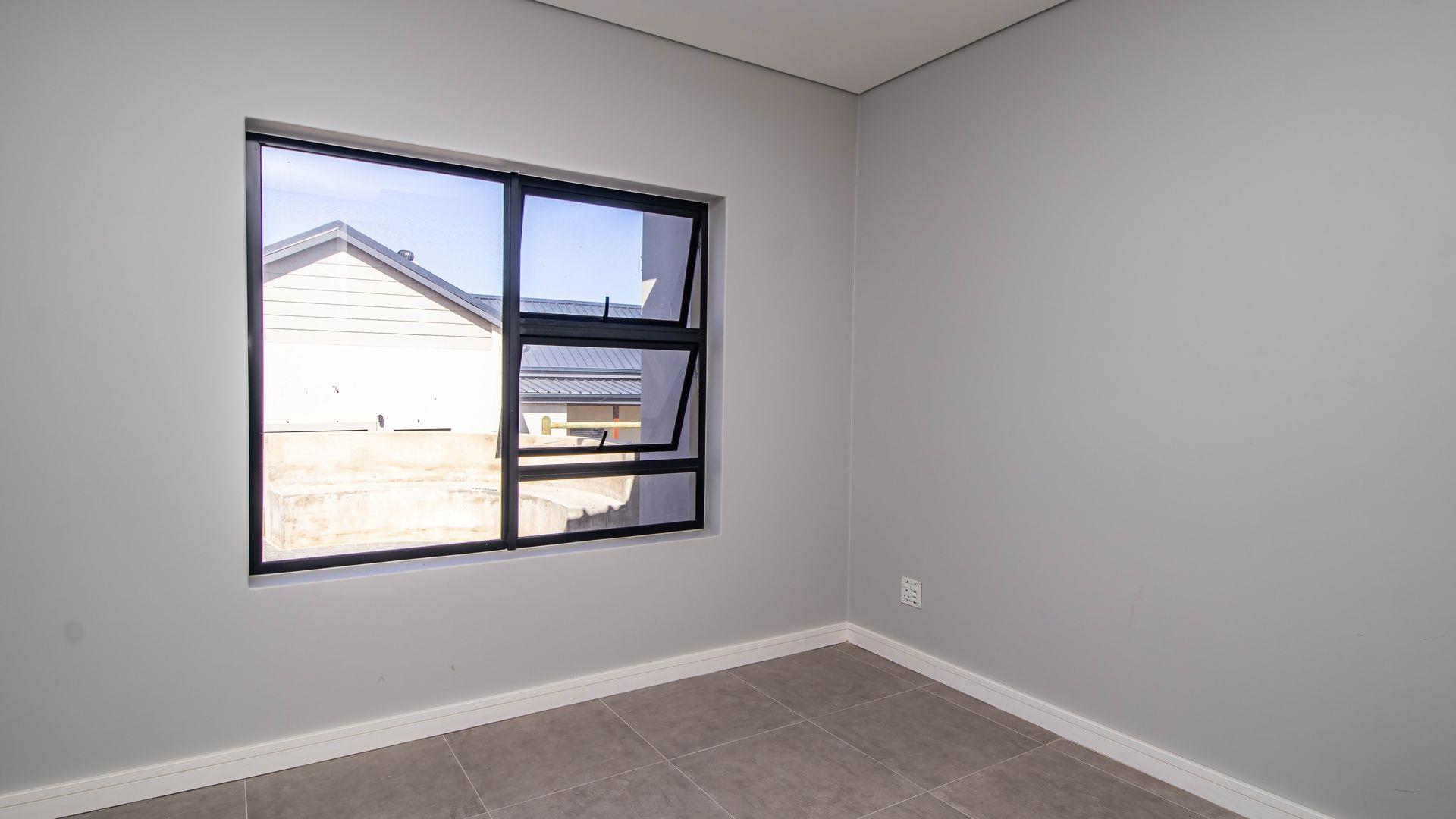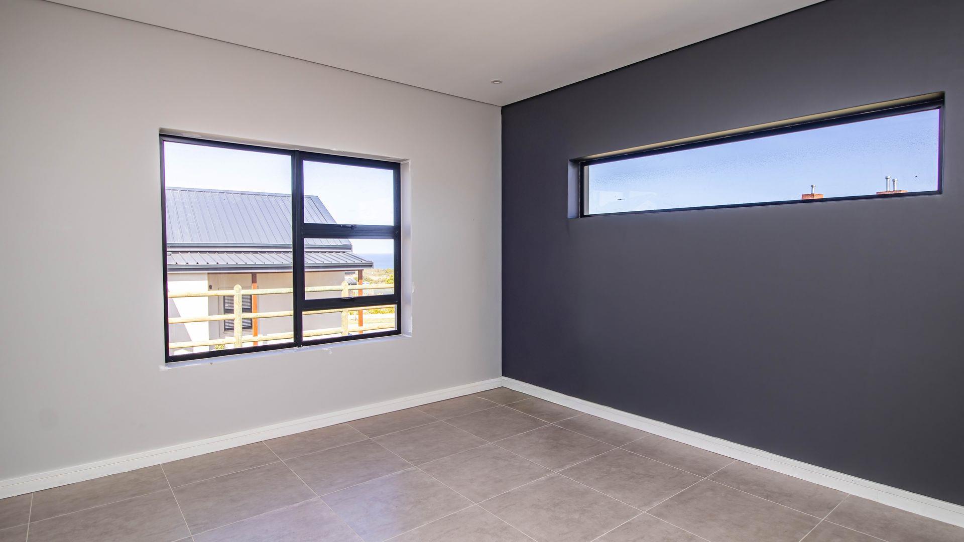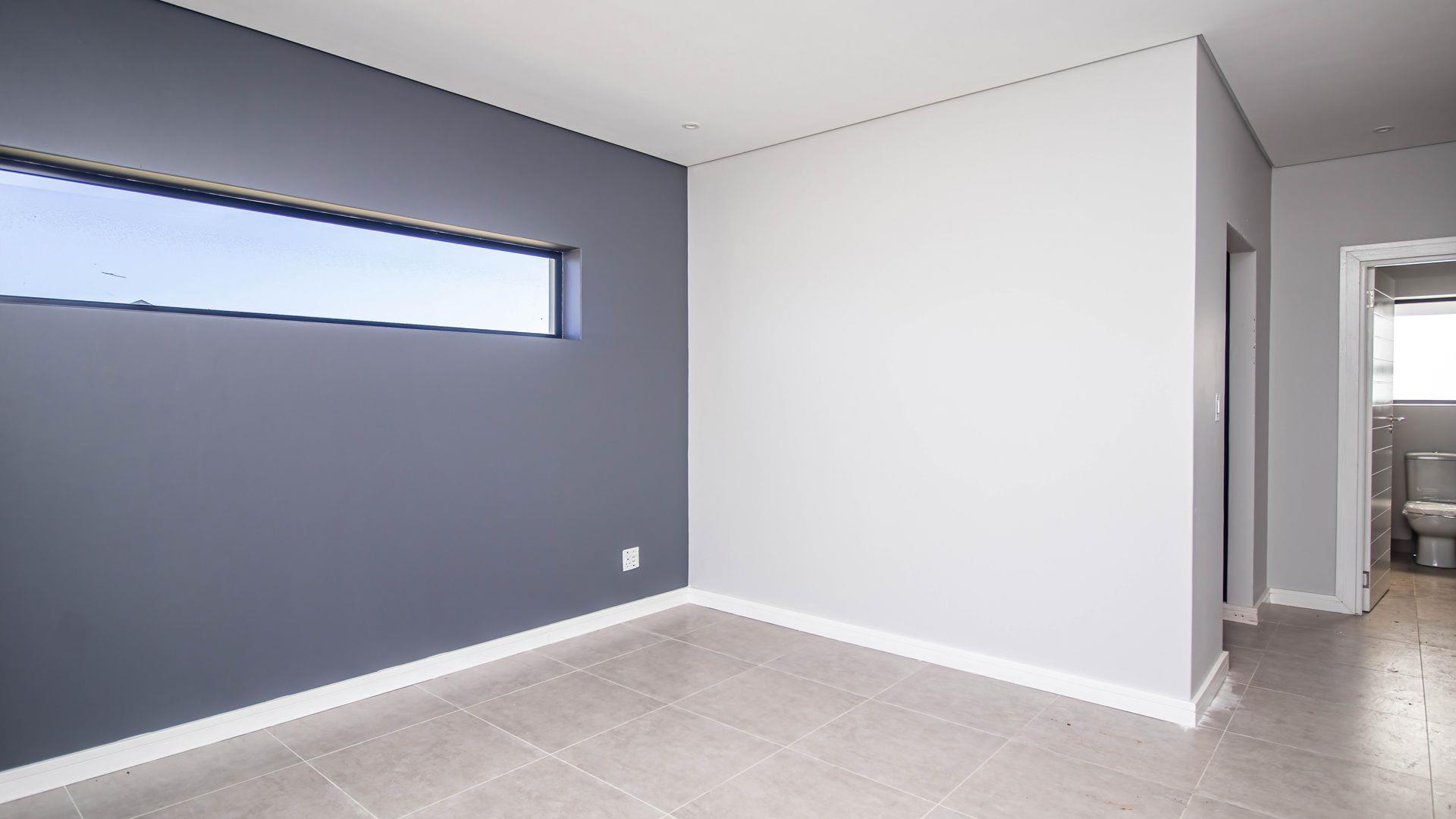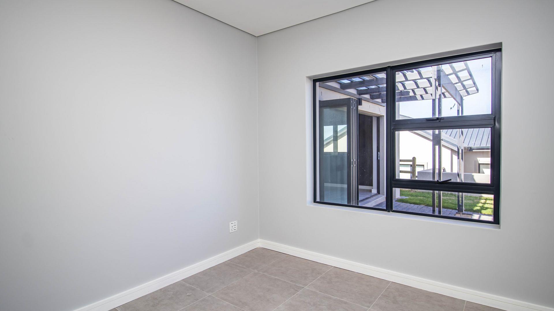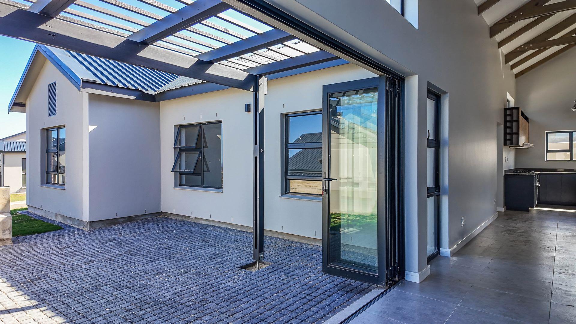 The open-plan living area also features an indoor braai area, making it ideal for entertaining guests regardless of the weather. The modern kitchen is a chef’s delight, equipped with a gas hob, electric oven, and ample cupboard space to cater to all your culinary needs.