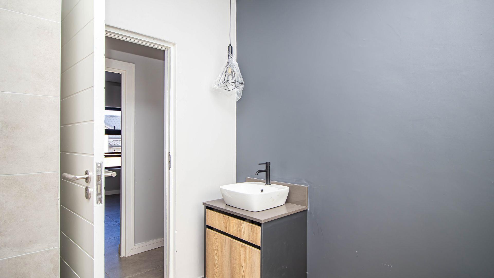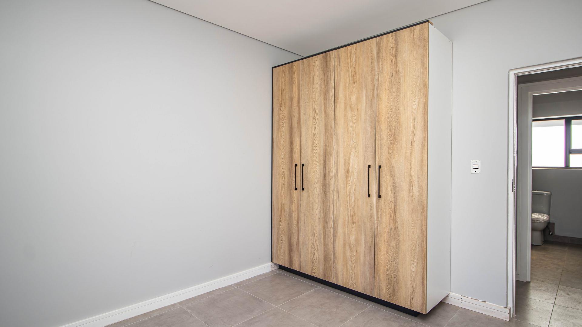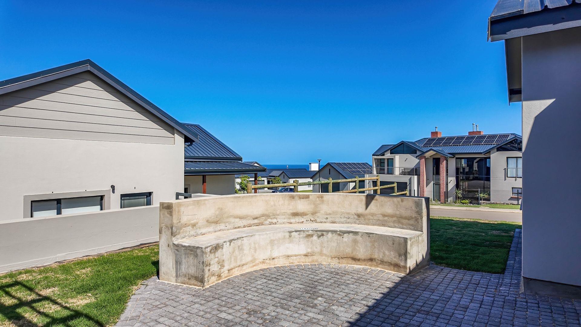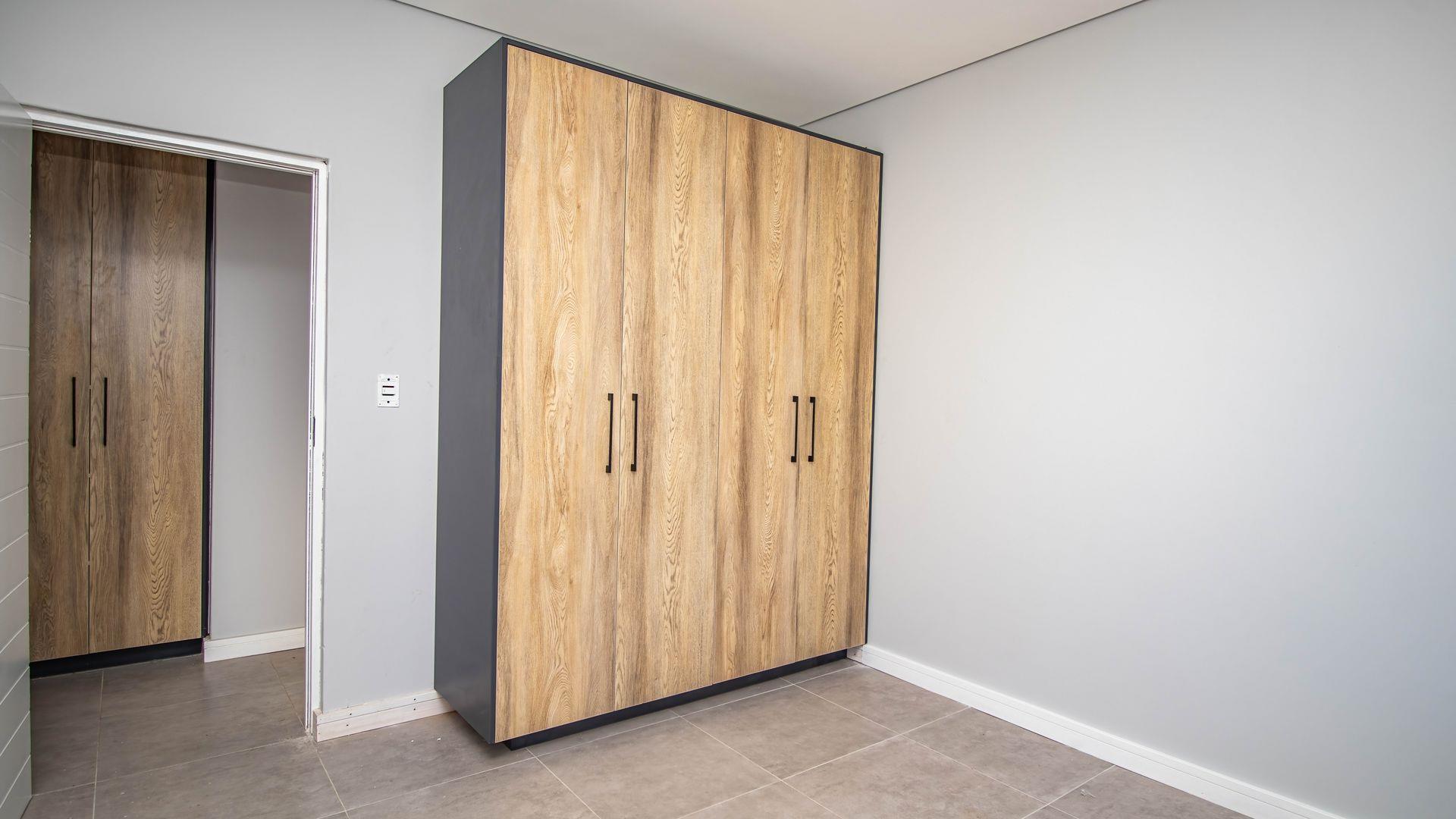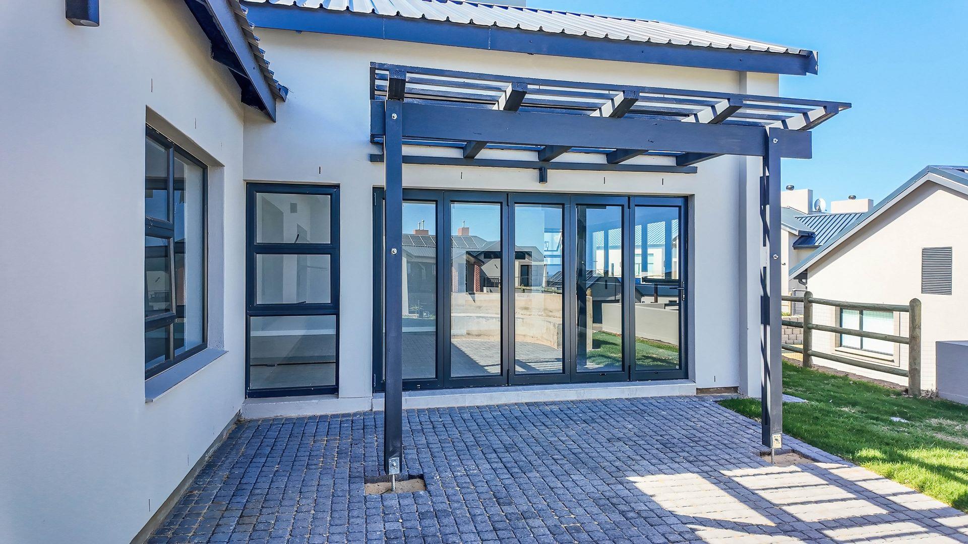 The open-plan living area also features an indoor braai area, making it ideal for entertaining guests regardless of the weather. The modern kitchen is a chef’s delight, equipped with a gas hob, electric oven, and ample cupboard space to cater to all your culinary needs.